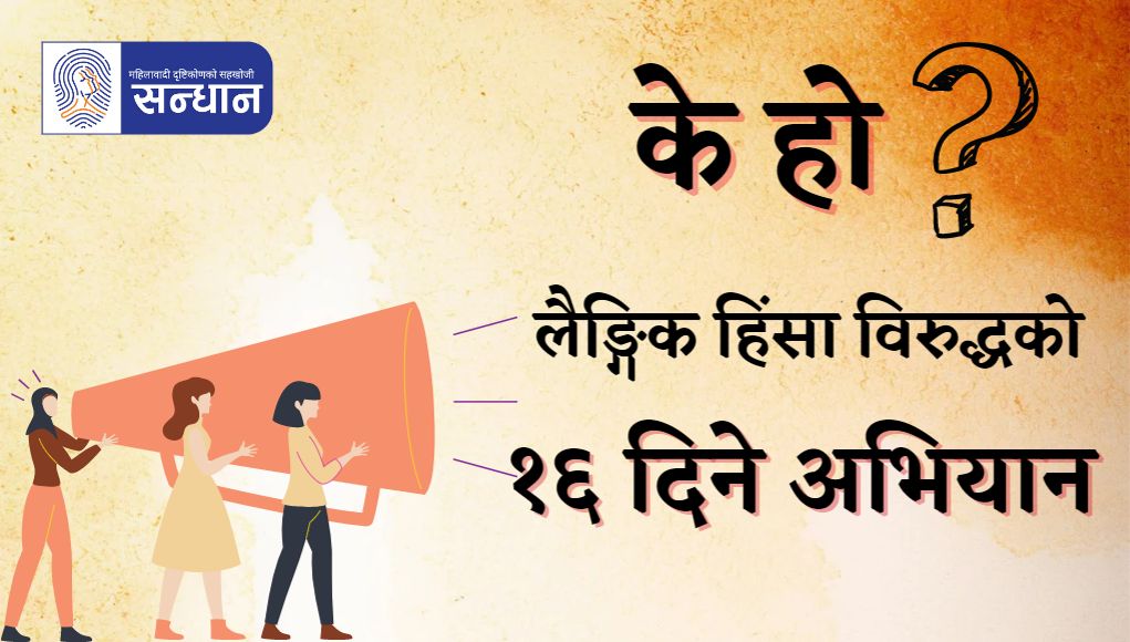 सन्दर्भ : लैङ्गिक हिंसाविरुद्धको सोह्रदिने अभियान लैङ्गिक हिंसाविरुद्धको सोह्रदिने अभियान चलिरहेको छ । हरेक वर्ष नोभेम्बर २५ देखि डिसेम्बर १० सम्म मनाइने यो अभियानको आज