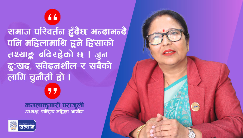 – कमलाकुमारी पराजुली, अध्यक्ष, राष्ट्रिय महिला आयोग लैङ्गिक हिंसामध्ये नेपालमा सबैभन्दा धेरै घरेलु हिंसा हुने गर्दछ । आर्थिक वर्ष २०७९/८० (२०७९ साउनदेखि २०८० असारसम्म) मा