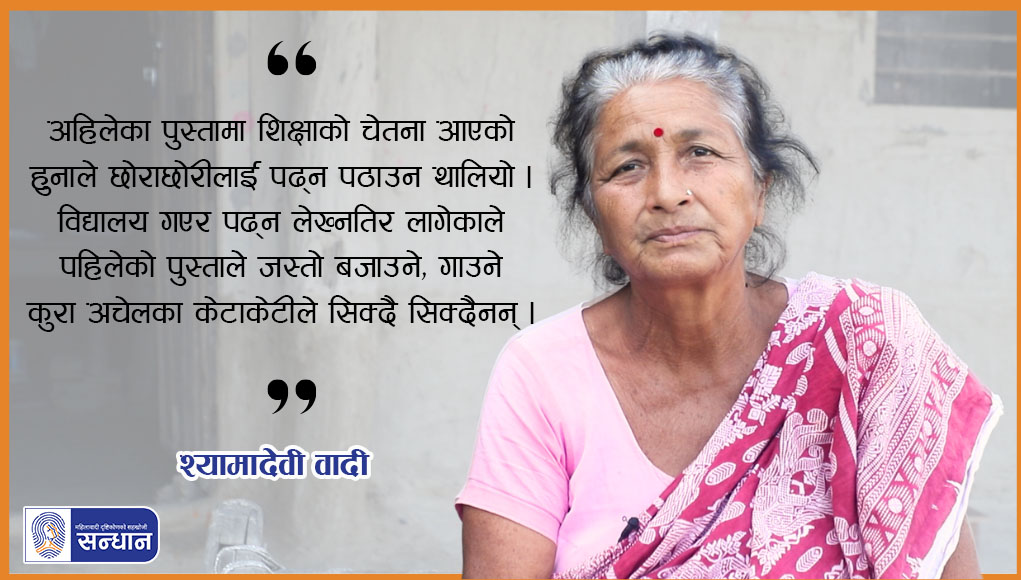 वाद्यवादन र नाचगान वादी समुदायको पुर्ख्यौली पेसा थियो । ६६ वर्षीया श्यामादेवी वादी कुनै बेला त्यही पेसा गर्नुहुन्थ्यो । पहिले नाच्ने, गाउने काम गरेर जीविका