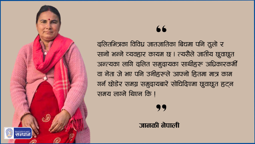 दुई दशक अघिदेखि दलित महिलाको अधिकारका लागि क्रियाशील जानकी नेपालीले भूमिहीन दलित समुदायको अधिकारका पक्षमा पनि काम गर्दै आउनुभयो । बझाङ जिल्लाकै बासिन्दा उहाँले स्थानीय