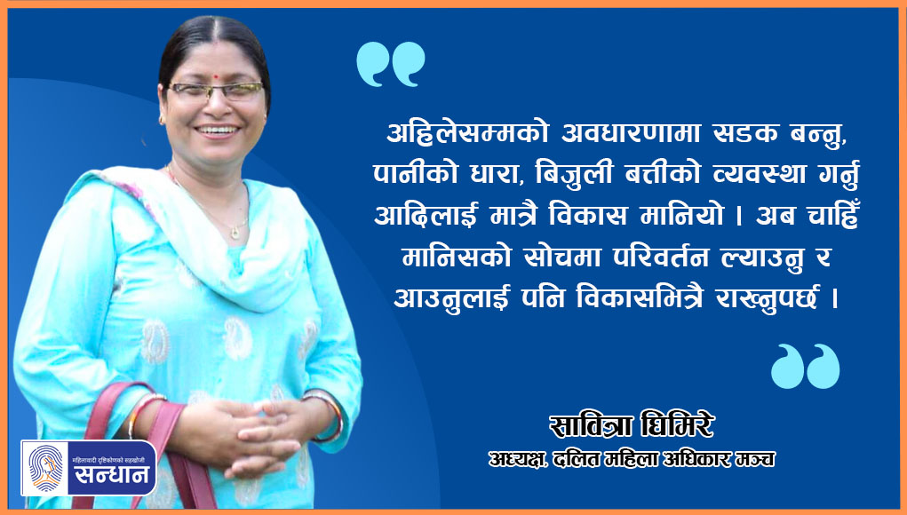 सावित्रा घिमिरे, कैलालीमा रहेको दलित महिला अधिकार मञ्चकी अध्यक्ष हुनुहुन्छ । उहाँले विभिन्न सङ्घसंस्था तथा सञ्जालहरूमा बसेर पनि काम गरिसक्नुभएको छ । उहाँले सानैमा जातीय