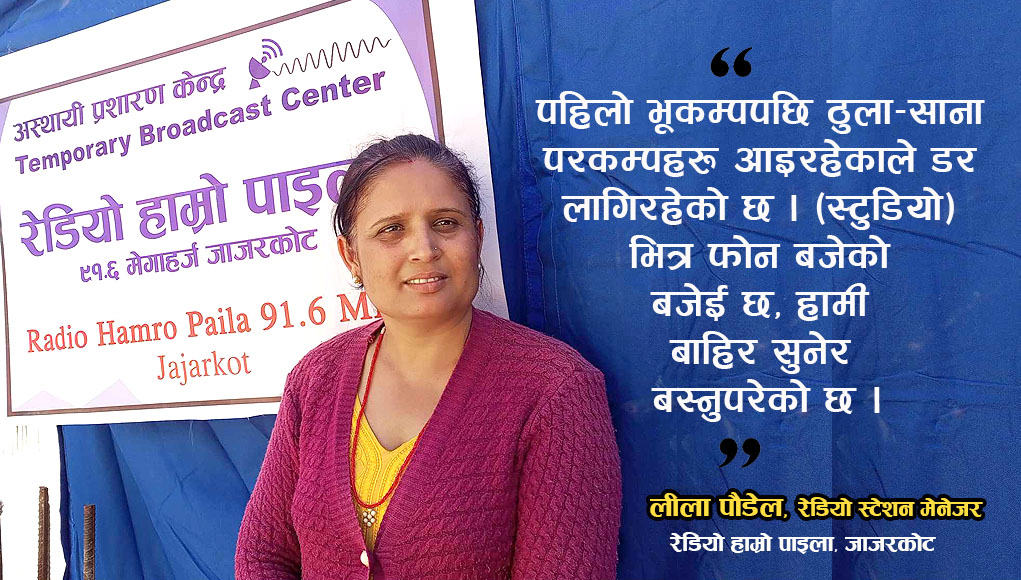 लीला पौडेल जाजरकोट जिल्लाको ‘रेडियो हाम्रो पाइला’ मा कार्यरत हुनुहुन्छ । २०६७ सालदेखि रेडियोमा आबद्ध उहाँ अहिले रेडियो स्टेशन मेनेजर हुनुहुन्छ । राष्ट्रिय विपद् जोखिम