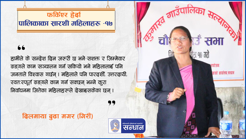 सन्धान संवाद शृङ्खला ९ कार्यकाल २०७४–२०७९ साललाई फर्किएर हेर्दा पालिकाका सारथी महिलाहरूको लहरमा देखापर्ने नाम हो, दिलमाया बुढा मगर (गिरी) । उहाँ देश सङ्घीय संरचनामा