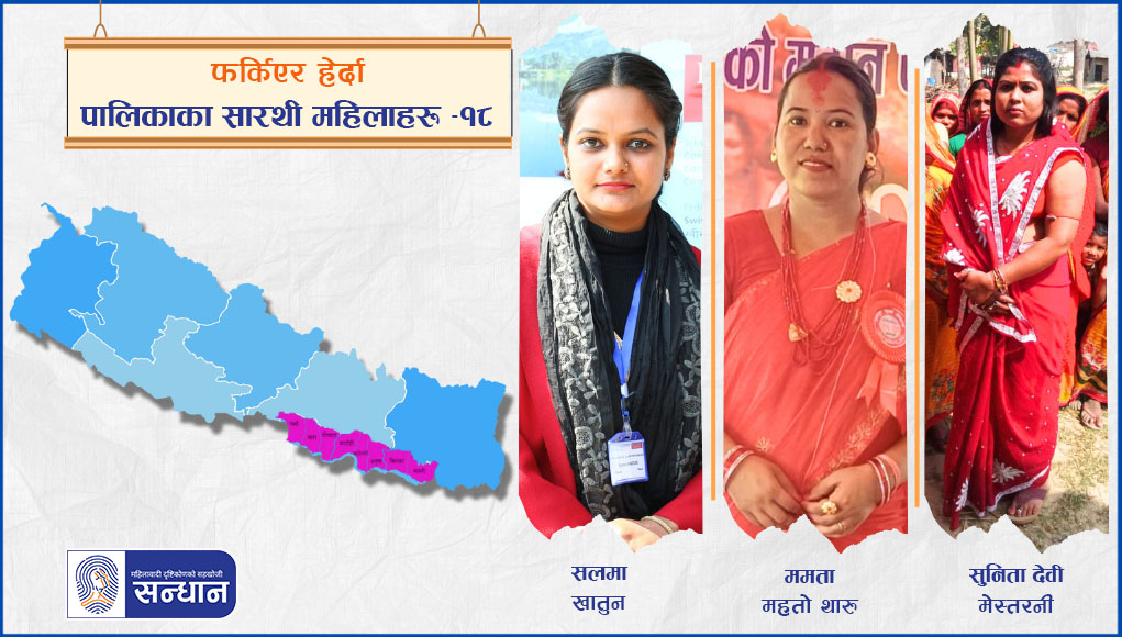 सन्धान रिपोर्ट शृङ्खला ९ कार्यकाल २०७४–२०७९ साललाई फर्किएर हेर्दा पालिकाका सारथी महिलाहरूको लहरमा अधिकांशतः उपाध्यक्षदेखि विभिन्न समुदायलाई प्रतिनिधित्व गरेका सदस्यहरू देखिन्छन् । संविधानसभाबाट २०७२ सालमा