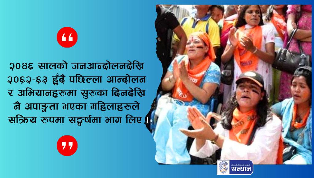 अपाङ्गता भएका महिलाहरू नेपालको राजनीतिक र सामाजिक आन्दोलनहरूमा सङ्गठित र सचेत भएर सक्रिय रूपमा सहभागी भएको पाइन्छ । इतिहासलाई फर्केर हेर्दा अपाङ्गता भएका महिलाहरूले पनि