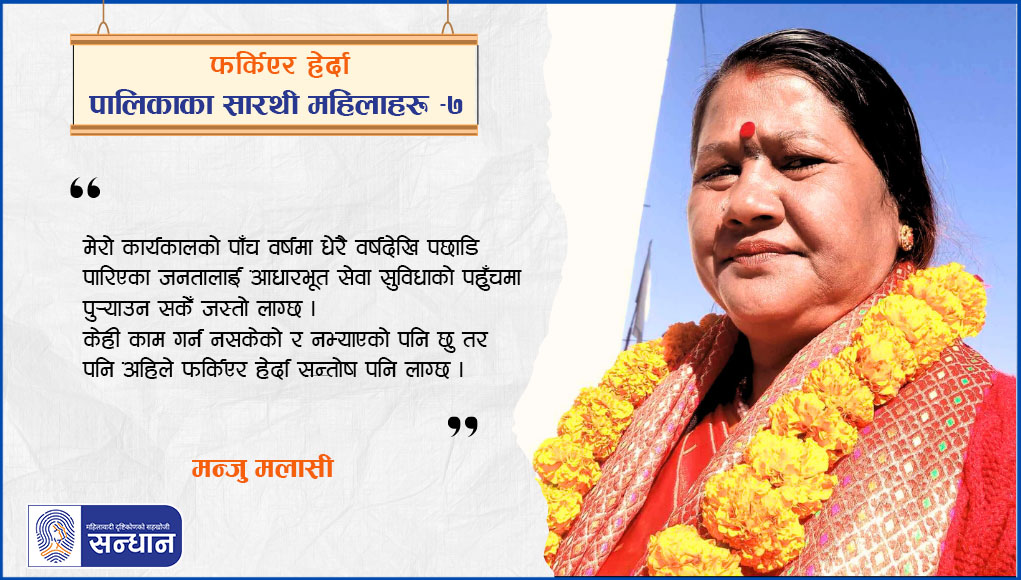 सन्धान संवाद शृङ्खला ४ कार्यकाल २०७४–२०७९ साललाई फर्किएर हेर्दा पालिकाका सारथी महिलाहरूको लहरमा देखापर्ने नाम हो, मन्जु मलासी । उहाँ देश सङ्घीय संरचनामा रूपान्तरण भएपछि
