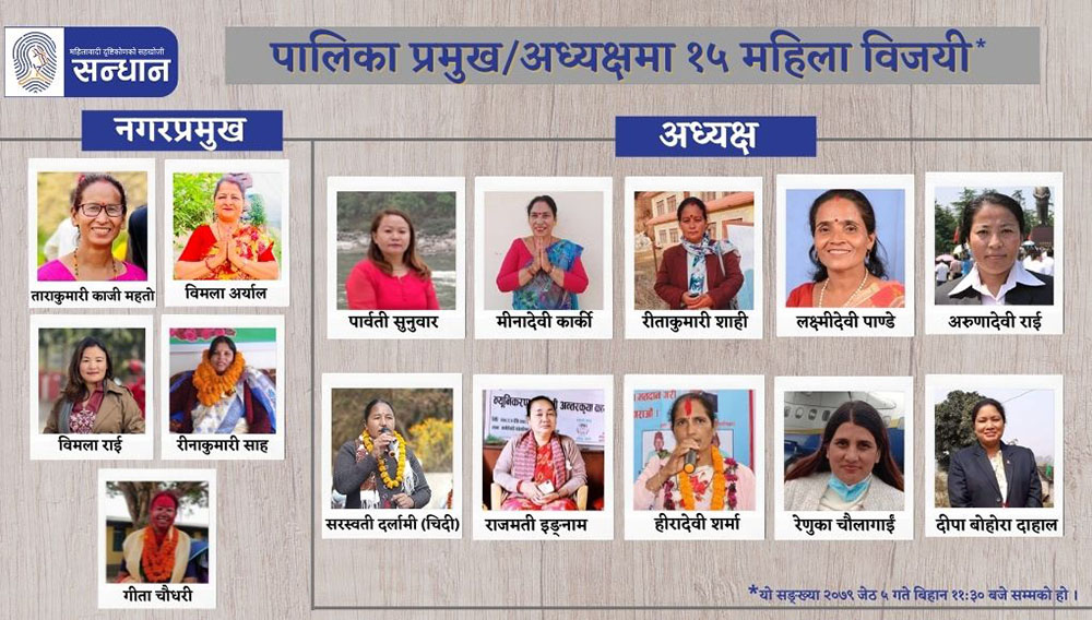 ‘स्थानीय तह निर्वाचन २०७९’ : बिहीवार बिहानसम्म प्रमुख/अध्यक्षमा १५ महिला विजयी वैशाख ३० गते भएको स्थानीय तह निर्वाचन २०७९ को मतगणना जारी छ । कुल ७५३ पालिकामध्ये बिहीवार बिहानसम्म ५५३ पालिकाको आधिकारिक नतिजा सार्वजनिक भइसकेको छ May 19, 2022 No Comments
