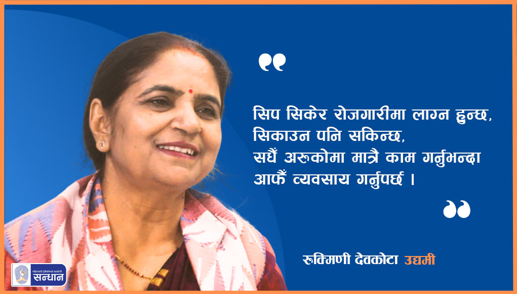 रूपक स्वेटर उद्योगकी संस्थापक र सञ्चालक रुक्मिणी देवकोटा महिलाले आत्मनिर्भर हुने बाटो रोज्नैपर्ने मान्यता राख्नुहुन्छ । पाल्पा जिल्लामा २०१८ सालमा जन्मिएकी उहाँले सानैदेखि आत्मनिर्भरताको बाटो