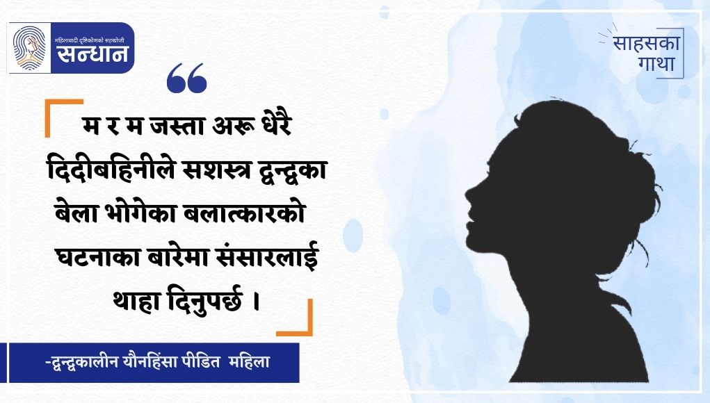 ‘साहसका गाथाहरू’ -१ ‘सन्धान’ ले आज नेपाली महिलाले १० वर्षे सशस्त्र द्वन्द्वका बेला भोगेका हिंसा र त्यो हिंसाजन्य पीडालाई पेलेर बहादुरीसाथ जीवन बाँचिरहेका साहसी महिलाहरूका