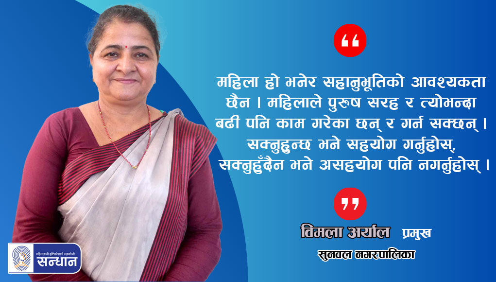 नवलपरासी (बर्दघाट सुस्ता पश्चिम) जिल्ला सुनवल नगरपालिकाकी प्रमुख विमला अर्याल लुम्बिनी प्रदेशको ३६ वटा नगर तथा उपमहानगर पालिका मध्येकी एक मात्र नगर प्रमुख (मेयर) महिला